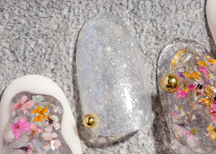 ランダムに見えるひなあられ風ネイルも、デザインをリンクさせれば統一感が生まれます。ドライフラワーの種類など、パーツを揃えるのがポイントです。
