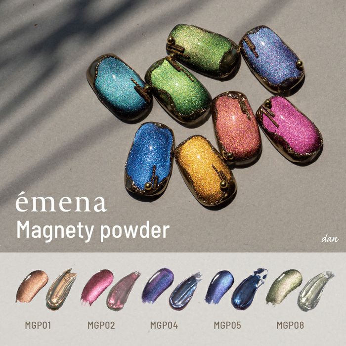 ミキシングジェルと混ぜて専用のマグネットを使用すると、奥行きのある模様やラインが浮かび上がる。混ぜるジェルによって輝きが変わり、ミラーパウダーとしても使える不思議なパウダー。