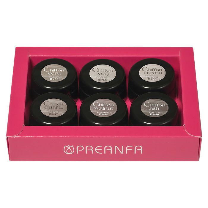 操作性・発色・密着力にこだわったプリジェルカラーEXから、こちらはシルクシフォンシリーズの6色セットです。シーンを選ばずオールシーズン使えるカラーラインナップ。柔らかみのあるヌーディーカラーで、肌馴染みがよく上品な優しい指先に。オフィスネイルやニュアンスネイルにもおすすめ。