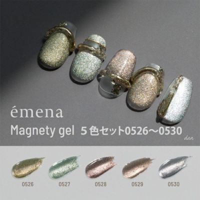 エメナマグネットジェルで色を迷ったり初使用の方はこちらの5色セットがおすすめです。 シルバー系、ゴールド系、ピンク系、グリーン系、ブルー系と揃っているので手持ちのカラージェルと合わせやすいです。 マグネットの反応が良いのでハートやフレンチ、ビー玉ネイルなど作りやすいです!